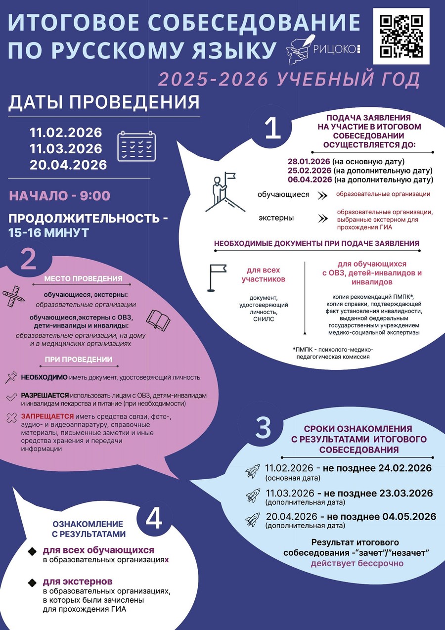 Итоговое собеседование по русскому языку проводится для учащихся, экстернов во вторую среду февраля, в 2025 году 12 февраля.